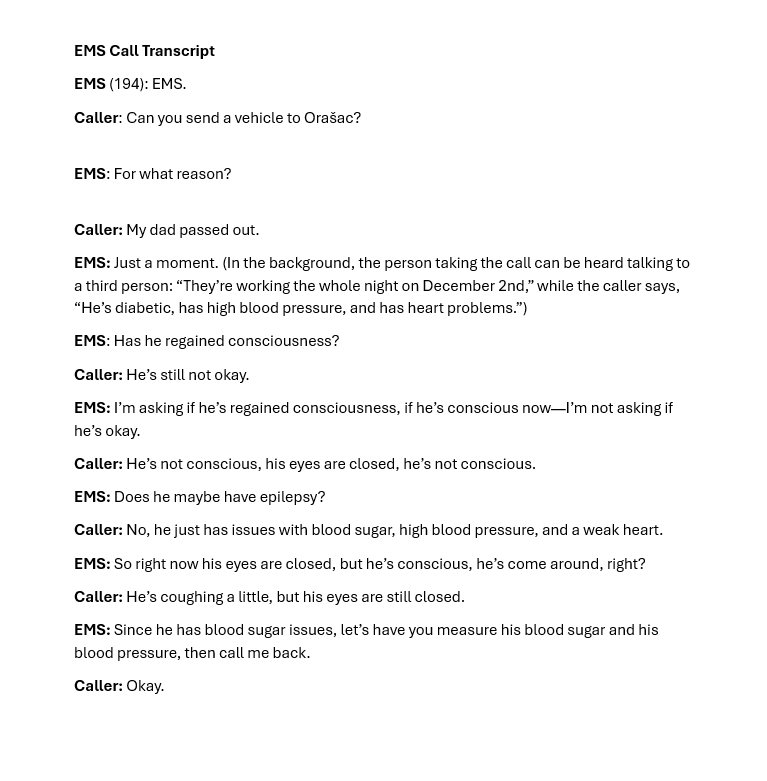 On November 30, 2024, Srdjan Jovanović lay unconscious in his family home in the village of Orašac near Leskovac – Serbia. His family called EMS three times, pleading for help. No one came. As they waited for a team that never arrived, his daughter and wife desperately tried to keep him awake—they washed his face, massaged him, and begged him to open his eyes. But EMS never came. He called for help. He died waiting for EMS.